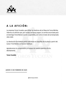 La empresa Toros Yucatán, que dirige los destinos de la Plaza de Toros “Mérida”, informa a la afición a través de un comunicado de prensa que, por causas de fuerza mayor, la corrida anunciada para el domingo 16 de febrero, queda suspendida , así como el resto de la temporada 2024-2025.