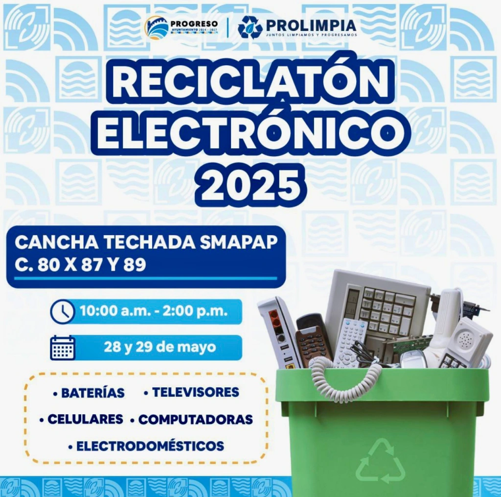 El Ayuntamiento de Progreso, encabezado por el Ing. Erik Rihani González, a través de la Dirección de Gestión Integral de Residuos Sólidos (PROLIMPIA), que dirige David Escalante Echeverría, invita a la ciudadanía a participar en el Reciclatón Electrónico 2025.