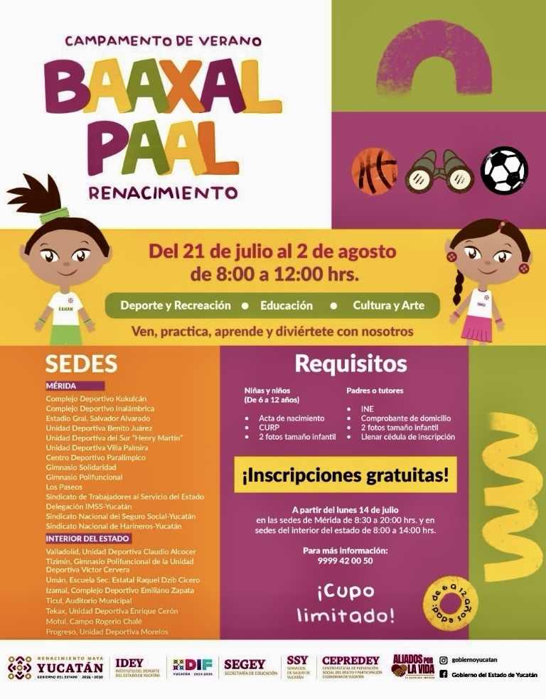 Con el objetivo de ofrecer espacios de desarrollo integral durante el receso escolar, el Gobierno del Estado, a través del Instituto del Deporte del Estado de Yucatán (IDEY), invita a las familias yucatecas a inscribir, a partir de este lunes, a niñas y niños de entre 6 y 12 años al Campamento de Verano “Baaxal Paal Renacimiento”, que se llevará a cabo del 21 de julio al 2 de agosto en 14 sedes deportivas ubicadas en Mérida, así como en ocho municipios del interior del estado.